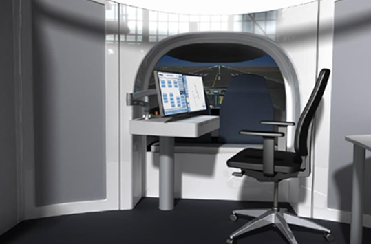 An IOS cabin and Instructor Workplace including a desk and touch screen monitors